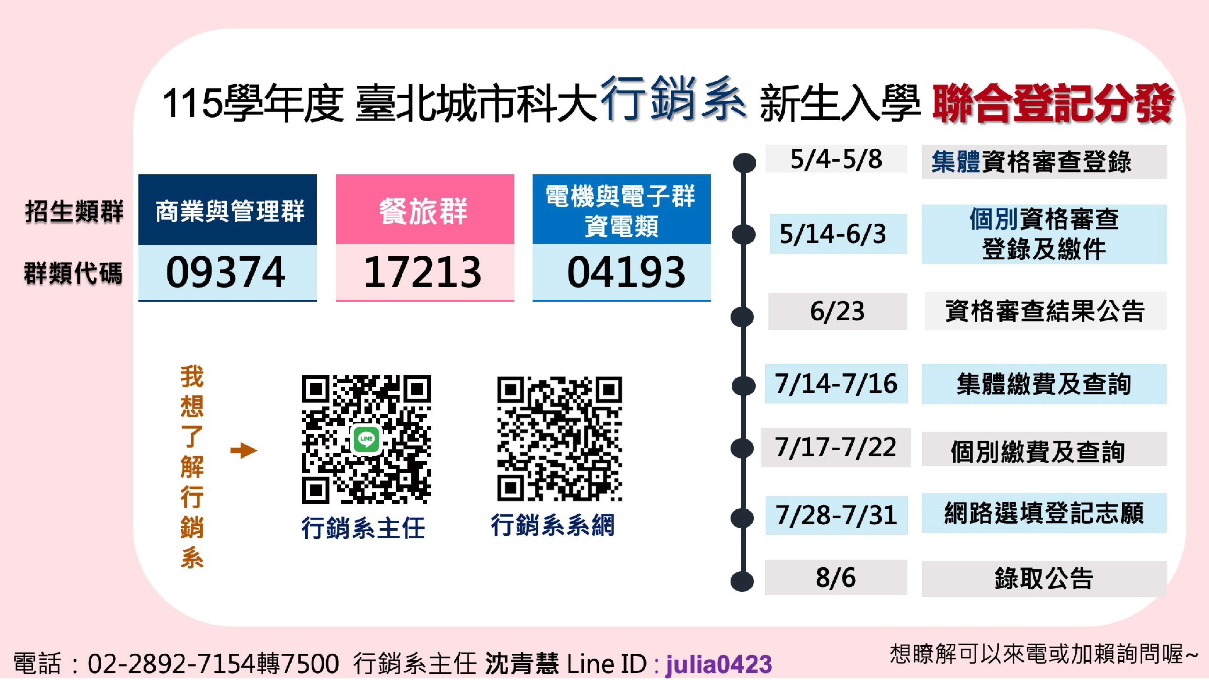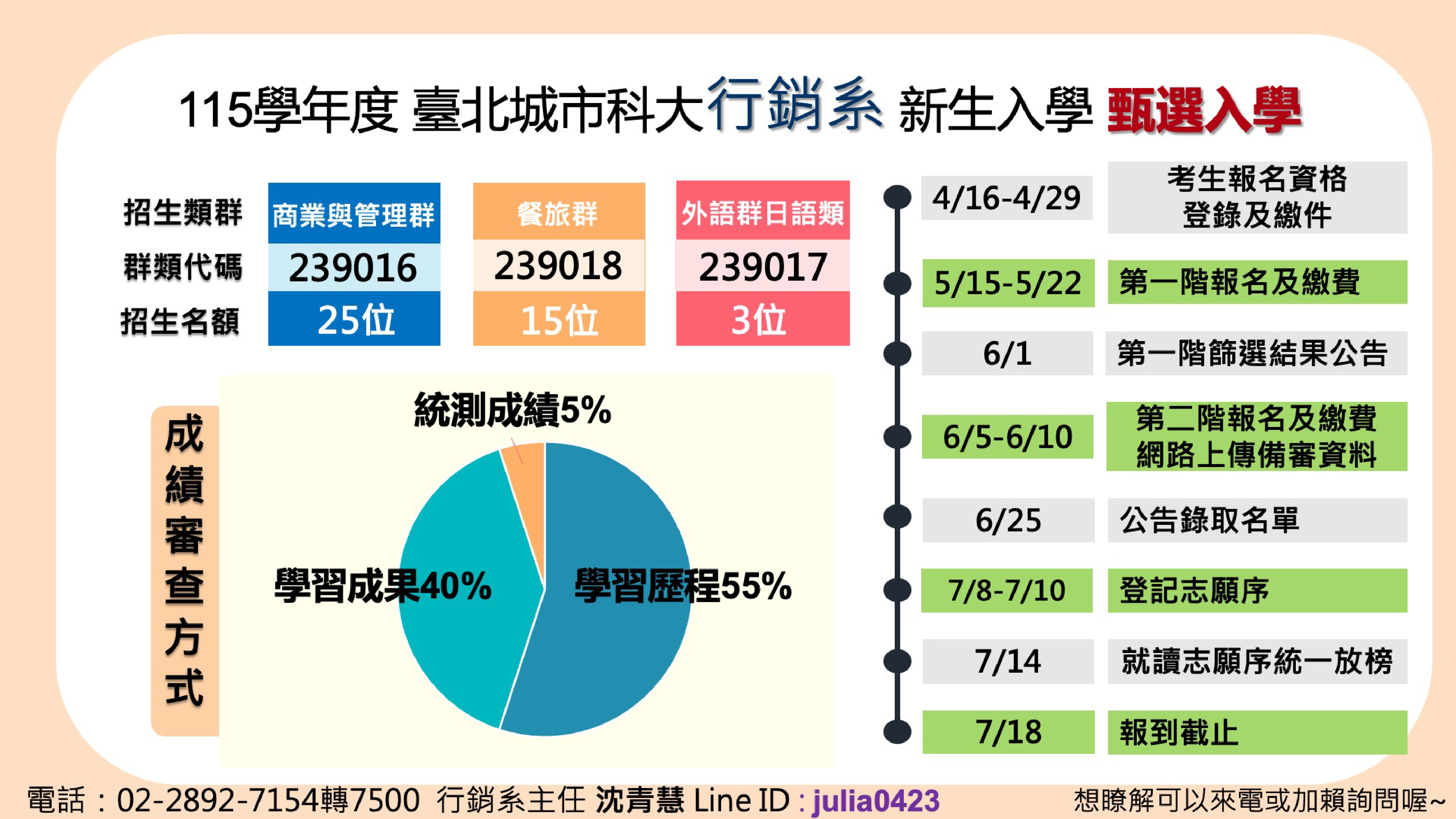 電話:(02)28927154 分機7500、7501 系主任LINE :julia0423